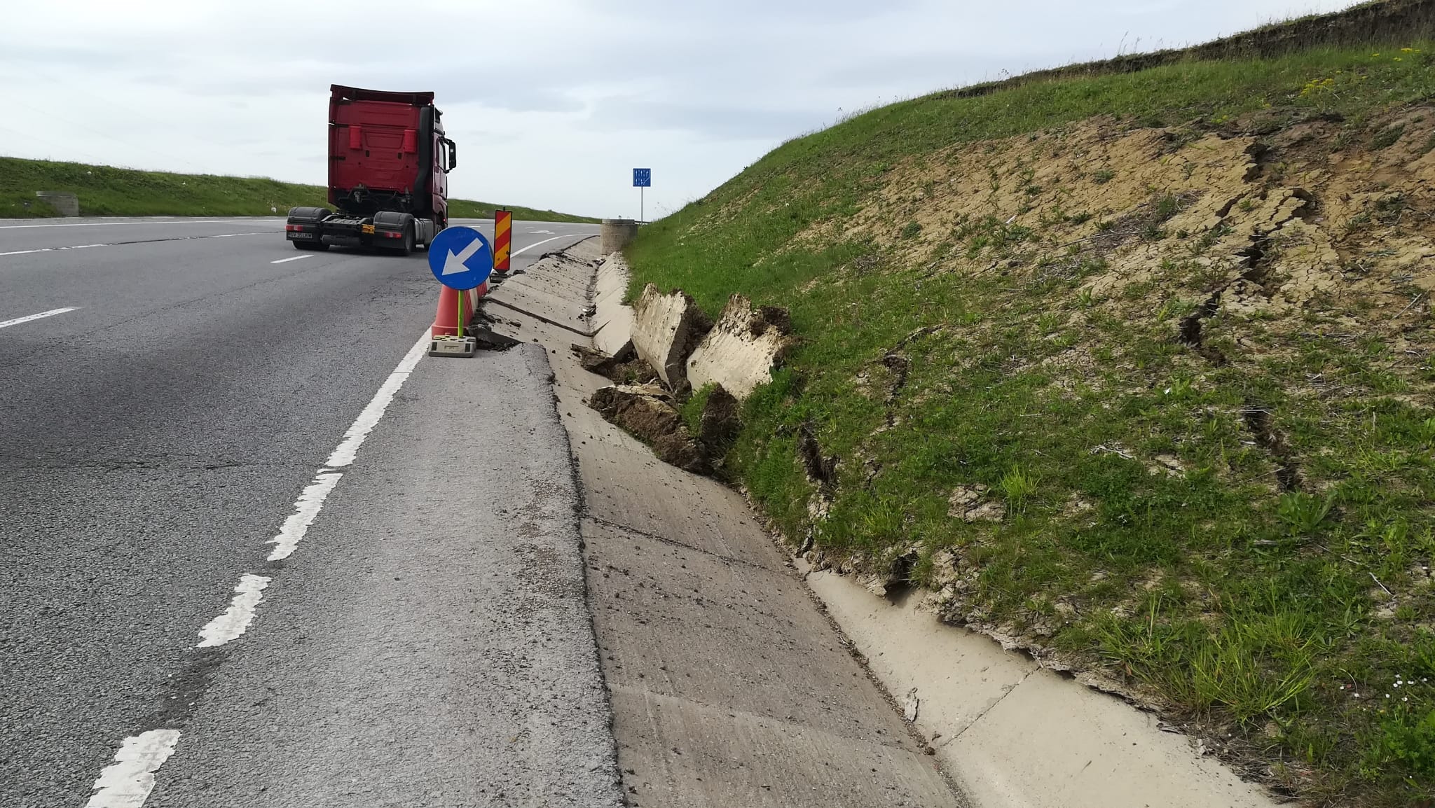 Urmare a acestui fenomen, taluzul s-a surpat pe o suprafață de aproximativ 320 mp, angrenând distrugerea șanțului pavat pe o lungime de 25m și înaintarea spre acostament cu 0,7 m.