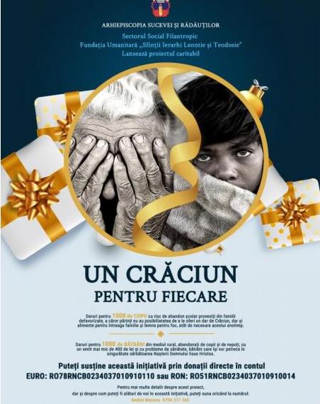 Totodată în această perioadă, Sectorul Social Filantropic al Centrului Eparhial Suceava, organizează proiectul caritabil „Un Crăciun pentru fiecare”, proiect ce are drep scop achiziționarea unui număr de 2000 de pachete care să conțină alimente de bază, haine și dulciuri, unui număr de 1000 de bătrâni și 1000 de copii din Bucovina.