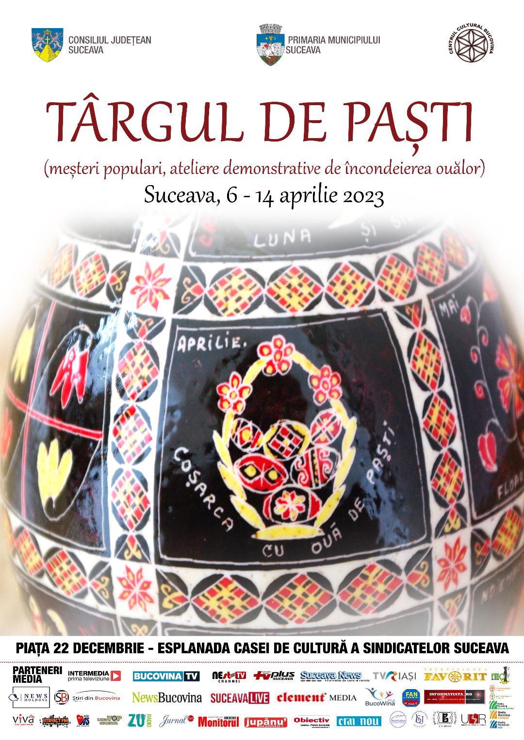 Consiliul Județean Suceava, prin Centrul Cultural ”Bucovina”, în parteneriat cu Primăria Municipiului Suceava, organizează în perioada 6 – 14 aprilie 2023, la Suceava, pe Esplanada Casei de Cultură a Sindicatelor Suceava, Târgul de Paști, un târg de meșteri populari.