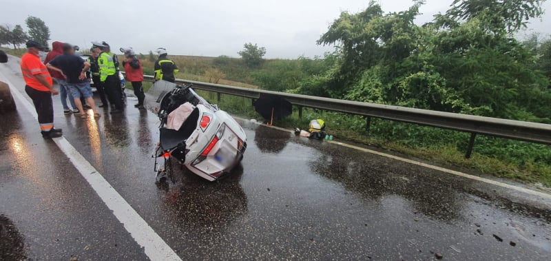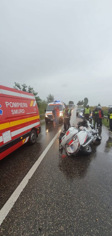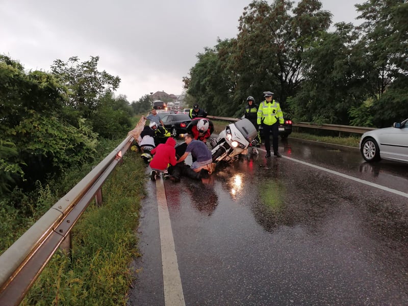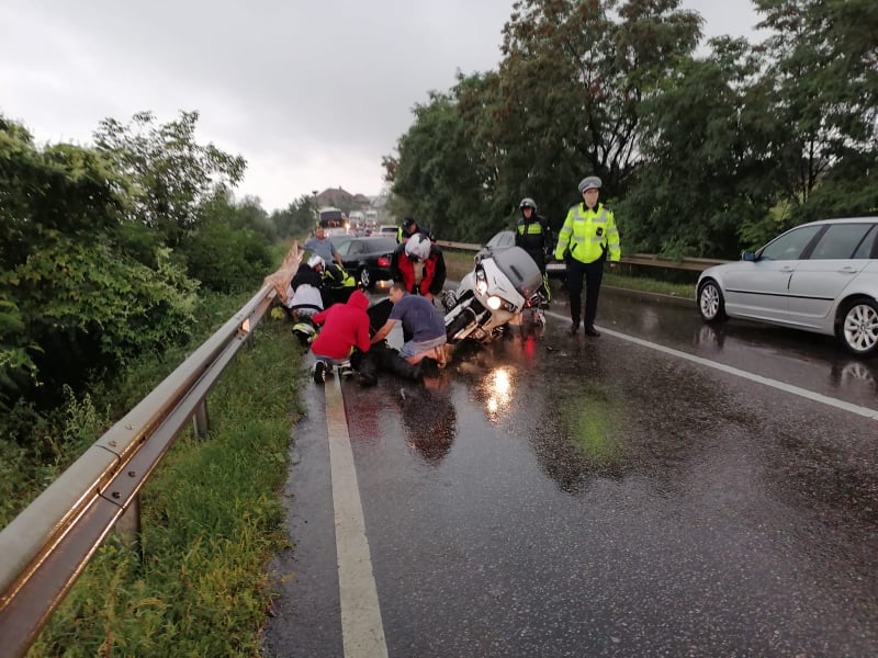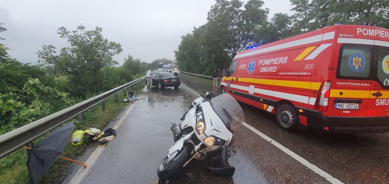 Din accident a rezultat rănirea gravă a motociclistului şi a soției acestuia în vârstă de 65 de ani, pasager pe motocicletă, care au fost transportaţi cu ambulanţa la spital pentru acordarea de îngrijiri medicale.