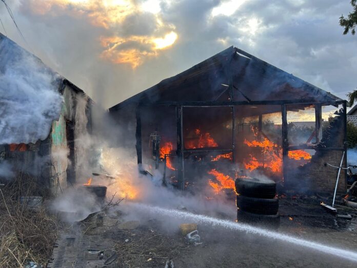 Au ars clădirea dezafectată, garajul, autoturismul parcat în interior, utilaje, unelte electrice și alte bunuri.