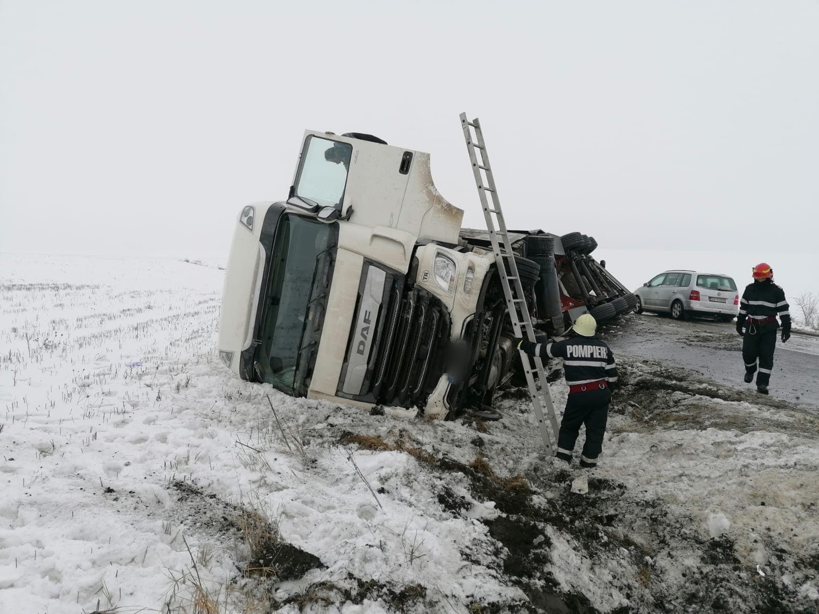 Autotren răsturnat pe partea carosabilă, în zona localității Grănicești, pe E85, sâmbătă dimineață.