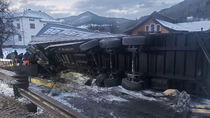 Un autotren încărcat cu deșeuri plastice s-a răsturnat în afara părții carosabile pe raza localității Molid, marți dimineață. Acesta a avariat un autoturism parcat în curtea unei proprietăți.