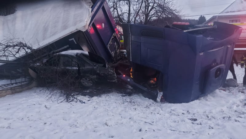 Un TIR încărcat cu deșeuri plastice s-a răsturnat peste un autoturism parcat într-o curte, la Molid